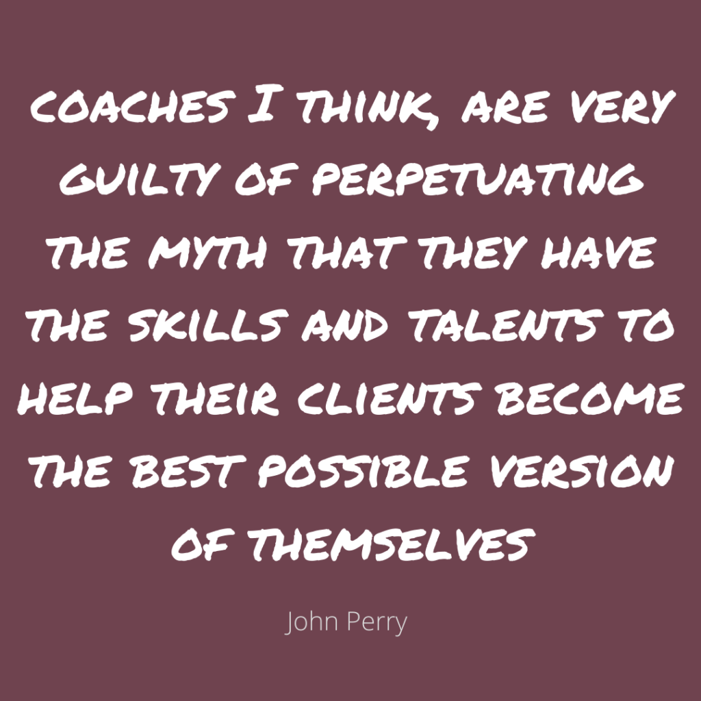 J: A couple of things I’d say: One is a lot of coaches I think, are very guilty of perpetuating the myth that they have the skills and talents to help their clients become the best possible version of themselves. And it’s a profoundly unhelpful thing to be saying, because it implies that there’s something wrong with them as they are, which is a profoundly unhelpful message to give someone “You’re not okay, now. But in some mythical point in the future you will be.” But also, this whole notion that a coach could help someone to complete the process of self actualization is a mythology. It’s just not true. None of us are totally self actualized.