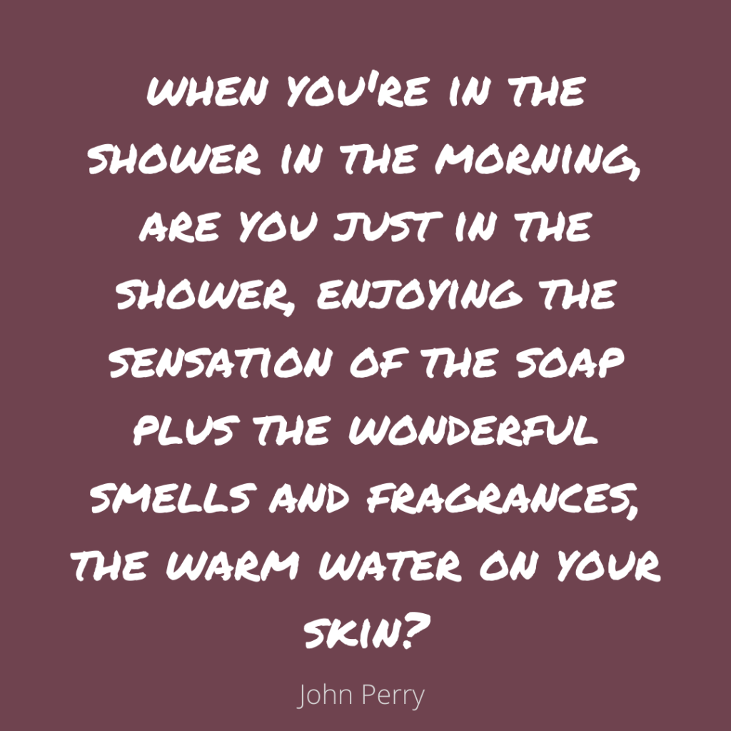 So often mindfulness, psychologists refer to this as a shower test. You know, when you’re in the shower in the morning, are you just in the shower, enjoying the sensation of the soap plus the wonderful smells and fragrances, the warm water on your skin? Or are you in the shower, still going over all that bad stuff that happened yesterday, and how you’re going to get even, or worrying about the stuff you’re going to have to do as soon as you get out of the shower. And if so, that shower isn’t going to revitalise you at all. So what you need to do is to give ourselves permission to pass the shower test, to be in a shower and just be enjoying that moment. And to do that throughout the day.