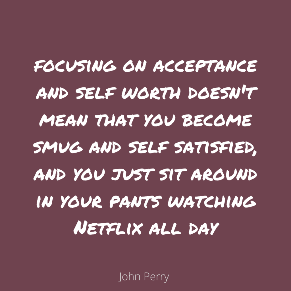 J: Yeah, I mean, I think two things really, one is, one of the phrases I quote from Carl Rogers, I really like is that “when I accept myself as I am, then I can change”. So, focusing on acceptance and self worth doesn‘t mean that you become smug and self-satisfied, and you just sit around in your pants watching Netflix all day. It‘s when you recognise that you already have innate worth and value, then, of course, you want to set off on this journey of self-improvement. But it starts with accepting yourself where you are. And I sometimes refer to the rather corny old joke about a guy who asks a drunk for directions. And the drunk says, Well, I wouldn‘t start from here. Well, actually, of course, ‘here‘ was the only place you can ever start from – you can only start from where you are.