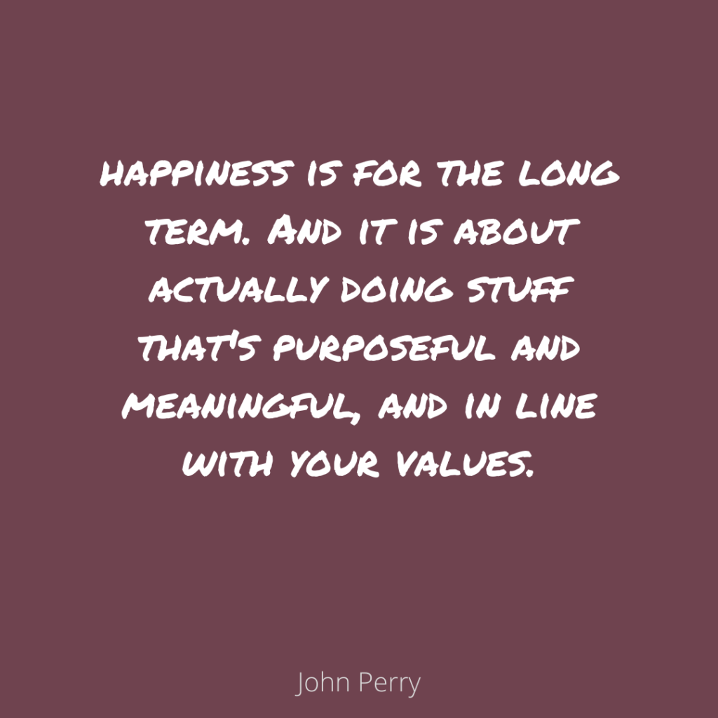 Happiness is for a long term. So my guess is there‘s not too much pleasure involved in running a marathon. It‘s not something I‘ve ever done, to be honest. And I‘m sure it‘s quite painful. And people talk about hitting the wall and having to go through it. And so, but I think in the longer term, it promotes happiness. And I think that‘s true of a lot of challenges in life, I think it‘s an error to pursue pleasure in kind of short-term fixes. Which is essentially what the problem drinker does, what the drug taker does, what the person who finds it impossible to commit to any one relationship does. It‘s they are earnestly seeking for that next burst of pleasure, but end up thoroughly unhappy very often. And those things, whether it‘s kind of compulsive, new sexual relationships, or drinking or drug taking action. Over time, they take a lot more than they give. They don‘t give happiness, happiness is for the long term. And it is about actually doing stuff that‘s purposeful and meaningful, and in line with your values.